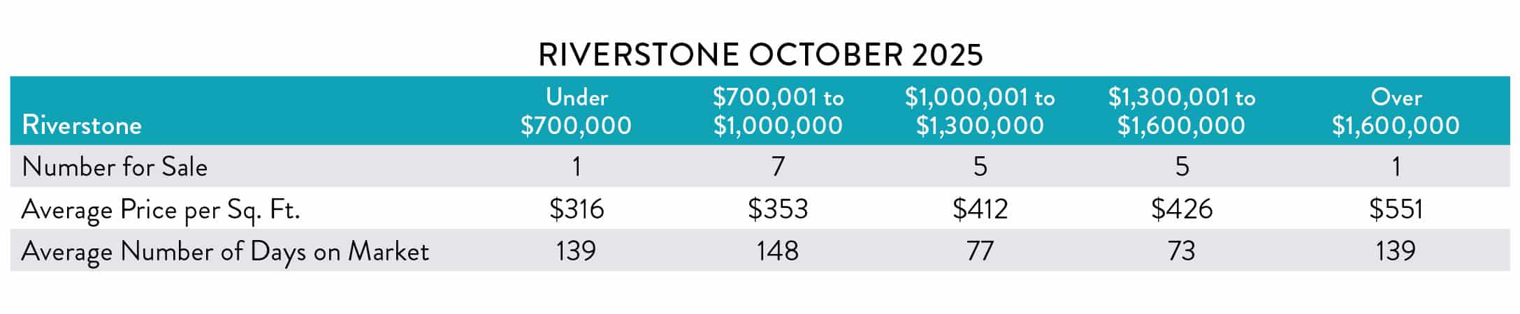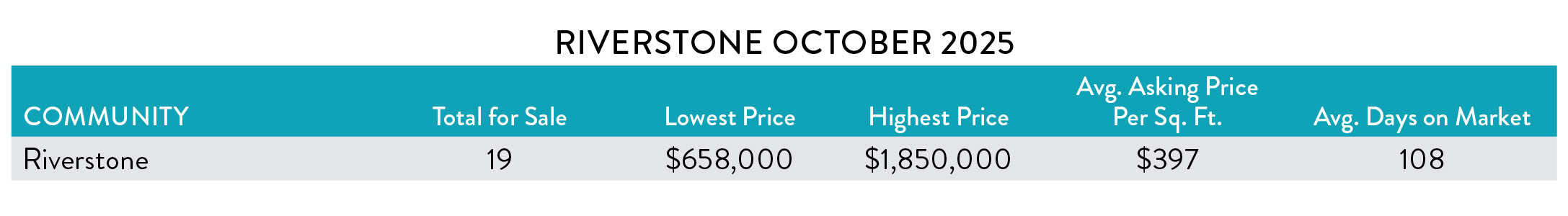 Riverstone is the community where Jeff and Nicola live. Riverstone has numerous amenities available for residents to enjoy. You can spend days swimming and relaxing at the community resort-style pool, playing tennis, taking a fitness class or socializing in the community’s private clubhouse. Here’s a look at the MLS market in Riverstone as of November 6, 2025: