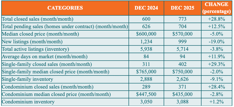 While the number of properties available under $300,000 has slowly declined in the last few years, the December Market Report showed the inventory of condominiums under $300,000 has been on the rise, leading to a 28.4 percent increase in closed sales of condominiums in this price category for December. Overall inventory in the condominium market in December increased 1.2 percent to 3,088 condominiums from 3,050 condominiums. An increase in condominium sales is anticipated in the first quarter of 2026 because condominium inventory under $300,000 increased 47.5 percent in December.