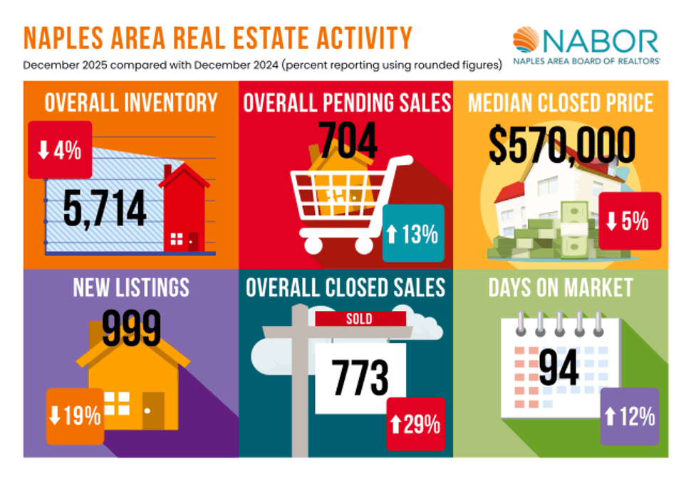 Naples, Fla. (January 23, 2026) – Overall closed sales in Naples during December increased 28.8 percent to 773 closed sales from 600 closed sales in December 2024. Broker analysts reviewing the December 2025 Market Report by the Naples Area Board of REALTORS® (NABOR®), which tracks home listings and sales within Collier County (excluding Marco Island), have been watching closed sales improve for seven months consistently. They believe the increase in sales is largely due to sellers being more willing to negotiate. Adjustments in prices – as a result of seller flexibility – effected a 2.5 percent decrease in the overall median closed price in 2025; and a 5 percent decrease in December to $570,000 from $600,000 in December 2024. With 8.3 months of inventory available to buyers heading into 2026, broker analysts are cautiously optimistic that closed sales will continue to increase as our transition to a more balanced market is ideal for homes sales in Naples.
