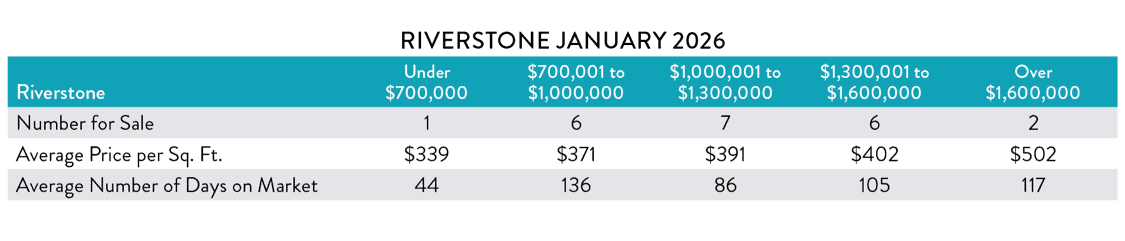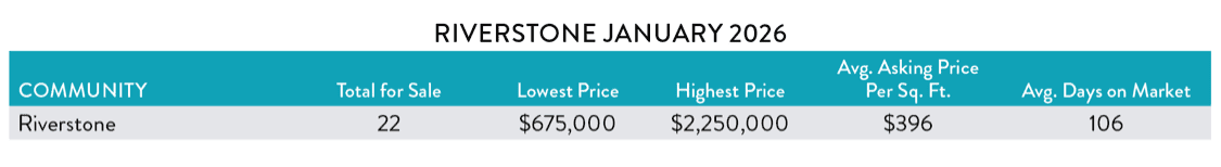 Riverstone is the community where Jeff and Nicola live. Riverstone has numerous amenities available for residents to enjoy. You can spend days swimming and relaxing at the community resort-style pool, playing tennis, taking a fitness class or socializing in the community’s private clubhouse. Here’s a look at the MLS market in Riverstone as of February 2, 2026: