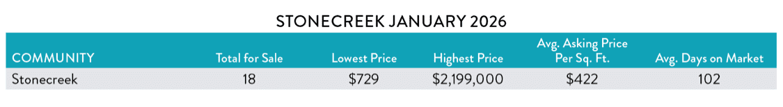 Stonecreek is the sister community to Riverstone, about a mile up Logan Blvd. and was built by the same developer, GL Homes. Both communities offer social, vacation-inspired lifestyles with extensive amenities & A-rated schools. Stonecreek is a bit newer and home prices in this community tend to be a bit higher than Riverstone. Here’s a look at the MLS market in Stonecreek as of February 2, 2026: