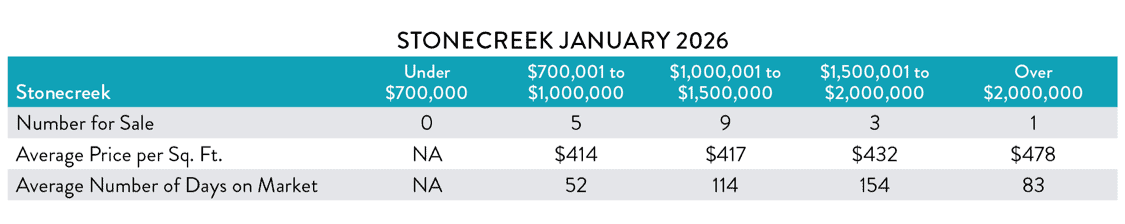 There are 18 active listings, 1 pending sale and 2 sales pending with contingencies. The MLS system lists 34 homes sold in the last 12 months. With average monthly sales at 2.83 per month, there is 6.3 months of inventory at Stonecreek.