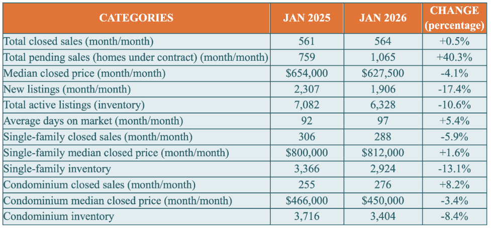 Despite a surge of 907 more new listings in January compared to December, overall inventory during January decreased 10.6 percent to 6,328 properties from 7,082 properties in January 2025, which highlights a rapid pace of sales outpacing new supply.